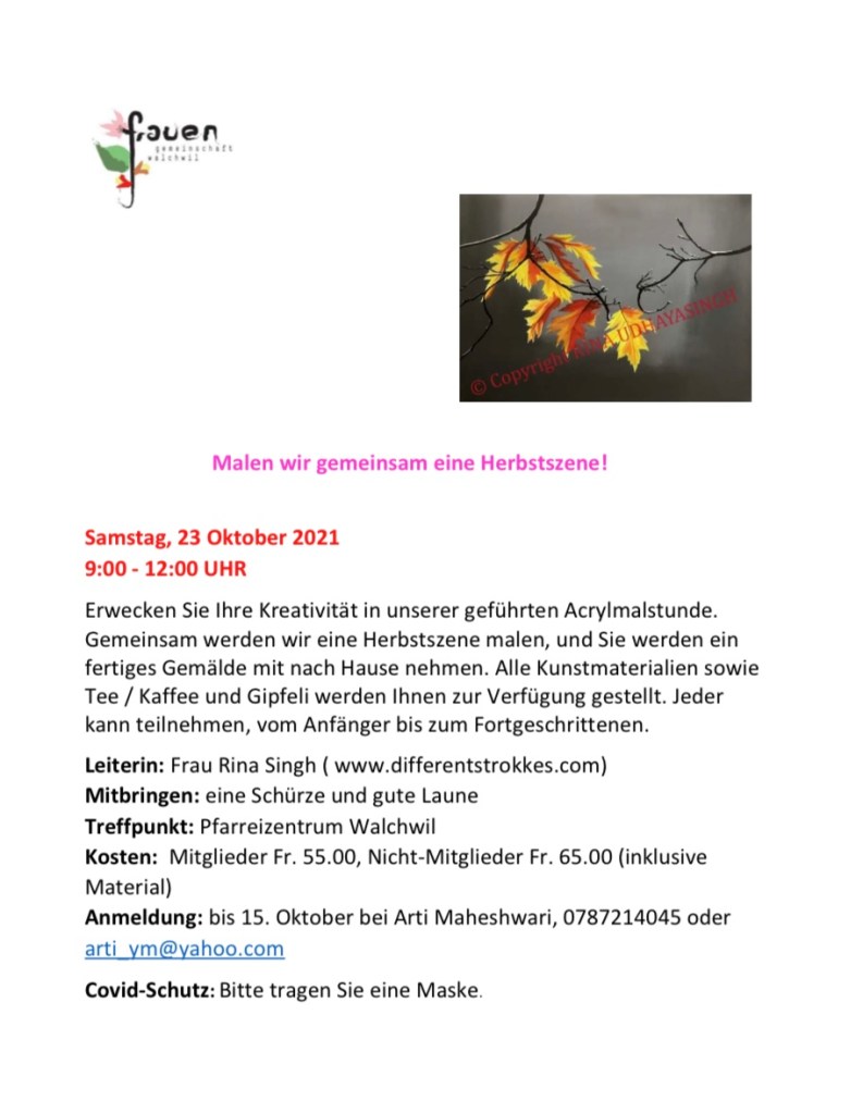 Taking their first ever painting lesson, a cheerful group of ladies spent a very creative morning, painting at the Parish center in picturesque Walchwil. At the end of three hours, each of them designed and created an amazing autumn themed acrylic painting on canvas and each painting was unique and as colourful as the season itself. Based on the positive feedback received, we plan to organise similar events in the New Year.
